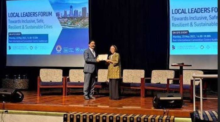 ইন্দোনেশিয়ার বালিতে চলমান দুর্যোগ ঝুঁকি হ্রাস ২০২২ বিষয়ক সপ্তম গ্লোবাল প্লাটফর্ম সম্মেলনে এমসিআর সনদ গ্রহণ করেছেন বাংলাদেশ পৌরসভা সমিতির সভাপতি ও নীলফামারী পৌরসভার মেয়র এবং জেলা আওয়ামীলীগের সভাপতি দেওয়ান কামাল