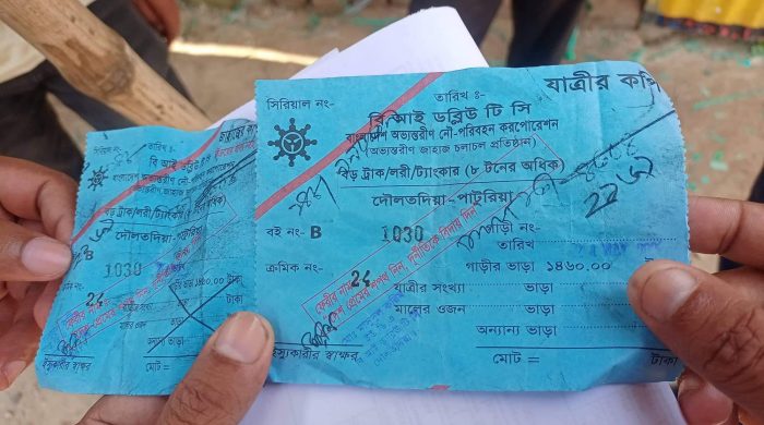 রাজবাড়ীর গোয়ালন্দ উপজেলার দৌলতদিয়া ঘাটে সাতক্ষীরা থেকে আসা একটি পণ্যবাহী ট্রাক চালকের সহকারীর কাছে বিআইডব্লিউটিসির ষ্টাফ পরিচয়ে ভুয়া টিকিট ধরিয়ে দেয়ার অভিযোগ পাওয়া গেছে। ওই টিকিটের বিনিময়ে চালকের সহকারীর থেকে