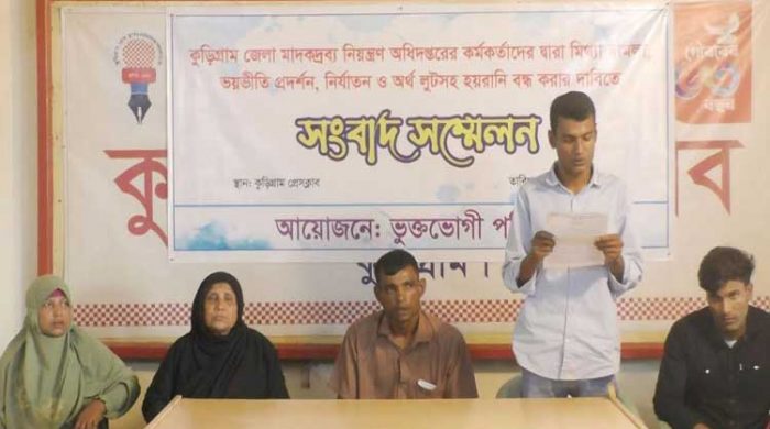 কুড়িগ্রামের রাজারহাটে জেলা মাদকদ্রব্য নিয়ন্ত্রণ অধিদপ্তরের কর্মকর্তাদের বিরুদ্ধে মিথ্যা মামলা, ভয়ভীতি প্রদর্শন, নির্যাতন ও অর্থ লুটসহ হয়রাণি বন্ধে সংবাদ সম্মেলন করেছে একটি ভুক্তভোগী পরিবার। মঙ্গলবার দুপুরে কুড়িগ্রাম প্রেসক্লাবে পরিবারের সদস্যদেরকে