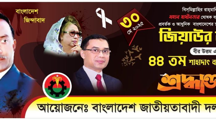 আজ ৩০ মে বাংলাদেশ জাতীয়তাবাদী দল বিএনপির প্রতিষ্ঠাতা শহীদ প্রেসিডেন্ট জিয়াউর রহমানের ৪৪ তম শাহাদত বার্ষিকী উপলক্ষে দোয়া মাহফিল ও আলোচনা সভার আয়োজন করেছে সাভার পৌর বিএনপি ও অঙ্গ সহযোগী